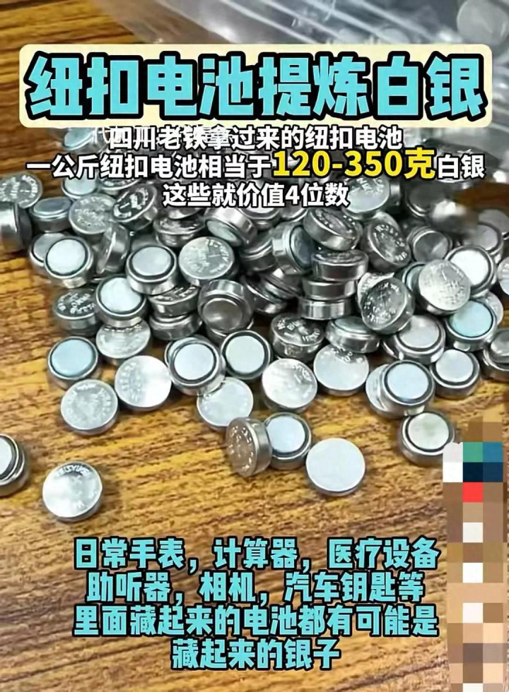 举个例子:你收集了1公斤家里的旧纽扣电池,其中只有30%是氧化银电池,银含量大概是36-105克,按5元/克算,价值180-525元,但提炼需要硝酸、盐酸等化学试剂,成本大概要200-300元,最后可能还赚不到钱,甚至亏本。