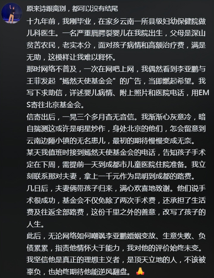 因为嫣然天使基金坚持20年的公益实践,为数万唇腭裂患者进行全额免费手术,李亚鹏的口碑,一夜之间翻盘了。