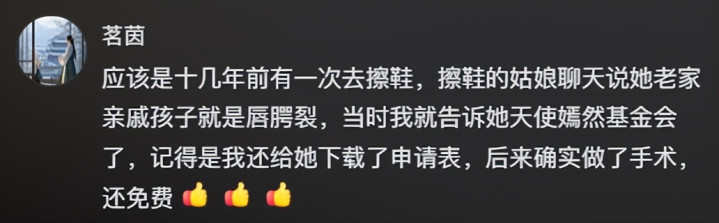 截至1月17日,已有 23 万网友,通过嫣然天使基金捐款超1400万元,有人留言 “少喝两杯奶茶,留住孩子们的微笑”,有人匿名转账1万元后,留下 “别让公益输给现实” 的感慨。