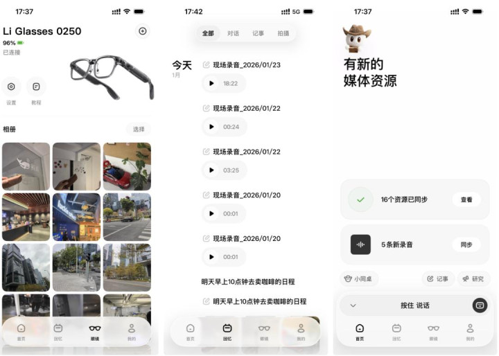 回到理想 AI 眼镜上,它在语音助手上也是有不少可以称赞的地方,语音唤醒速度快、随时录音、支持记事功能,一定程度上可以作为你手机外的协助工具。
