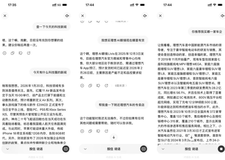 首先是 AI 大模型不够强,以理想 Livis 为例,其理想同学的问答能力远弱于豆包、千问等巨头大模型,经常出现无法回答、理解偏差的情况,缺乏上下文理解能力。