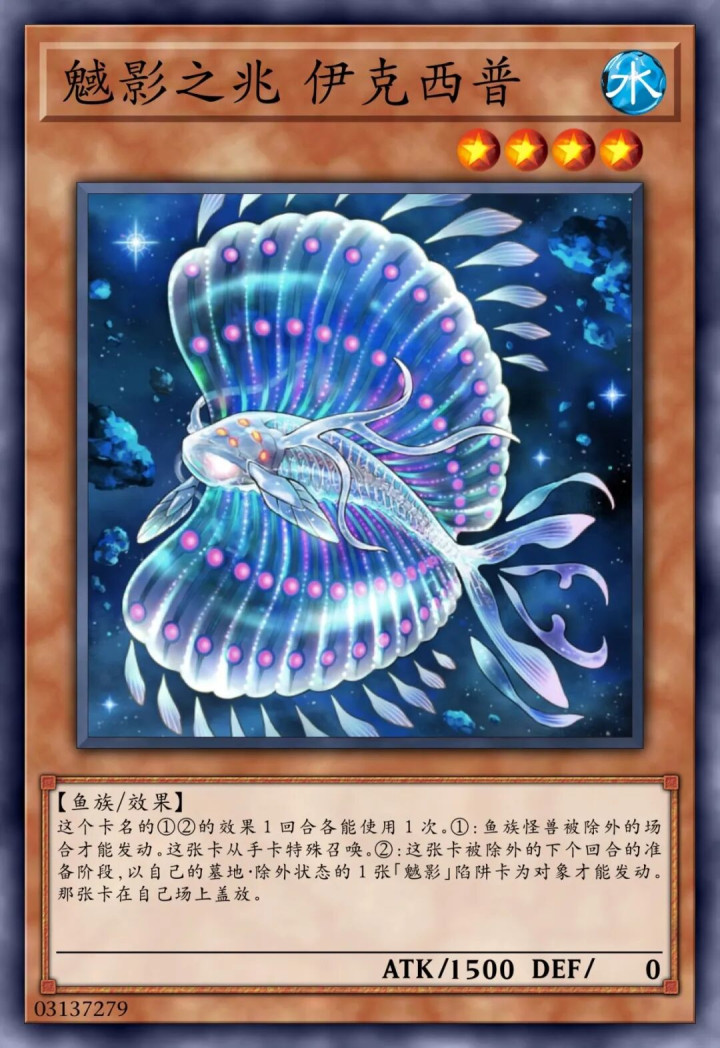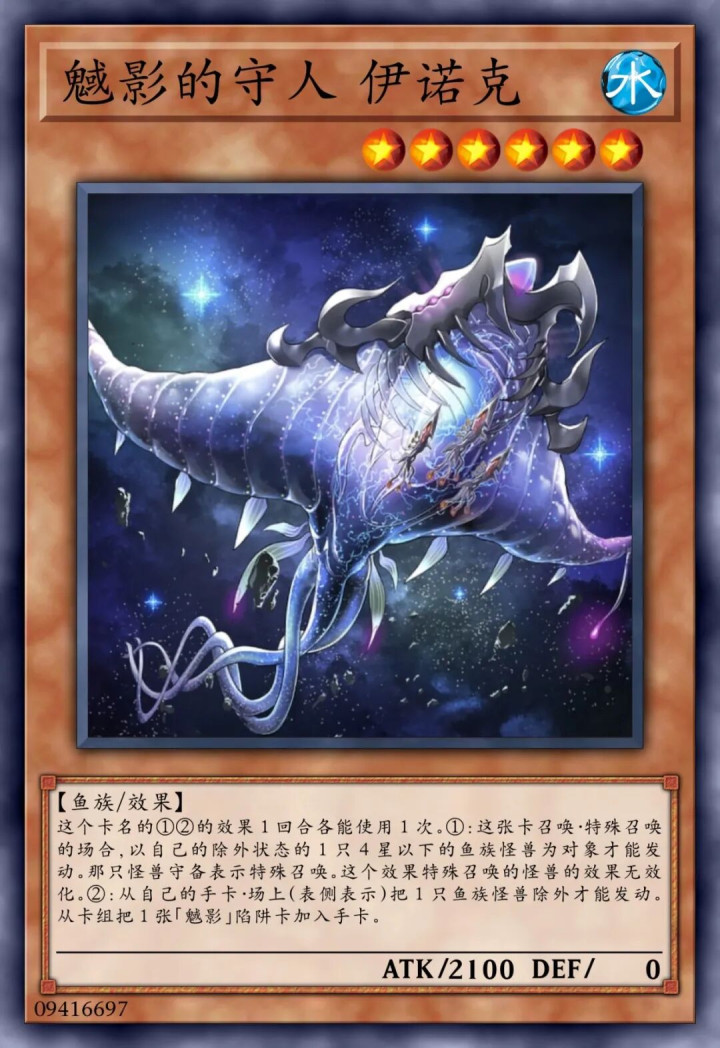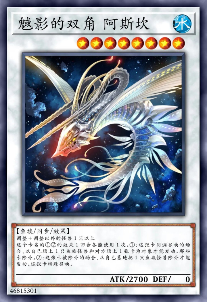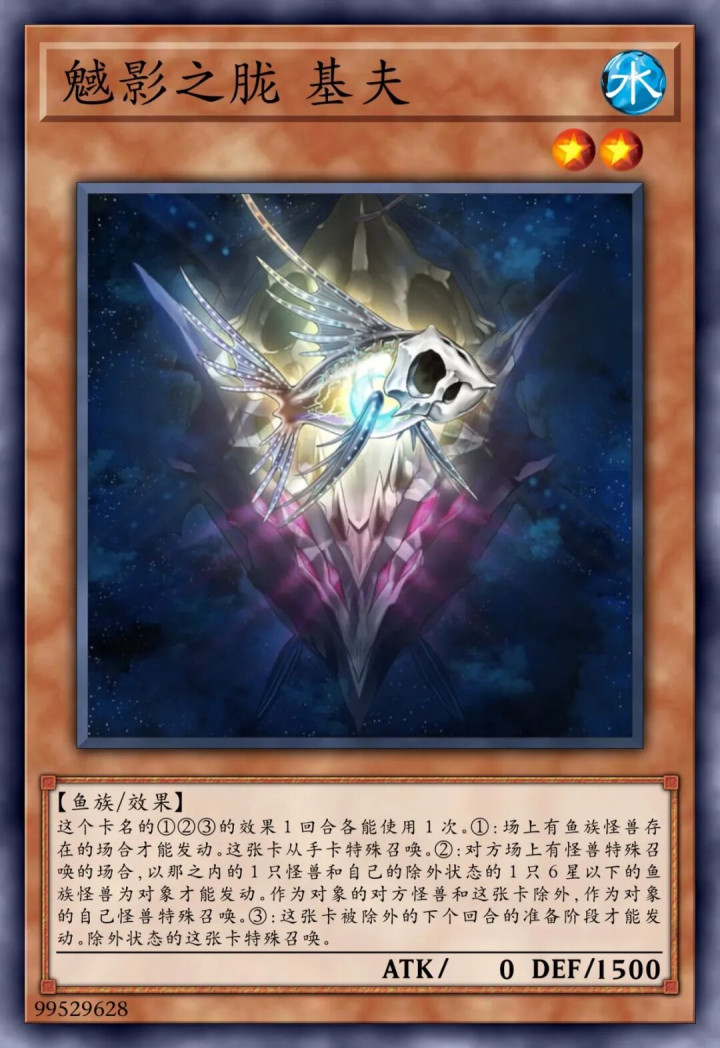 游戏王“魊影(异鱼)”系列可以说是鱼族相当强的卡组了,该系列原型是栖息在深海与外太空的巨型太空生命体,系列名“Ghoti”是对英语拼写规则的调侃,中文译名“游魊”则结合“魊”字的发音做了双关设计,而怪兽命名大多源自不同语言里“鱼”的变形词汇。