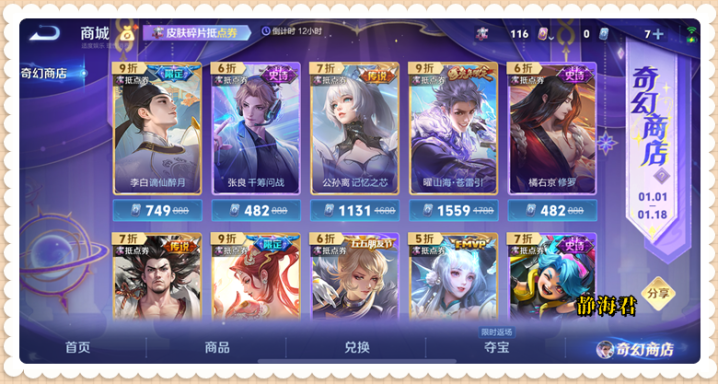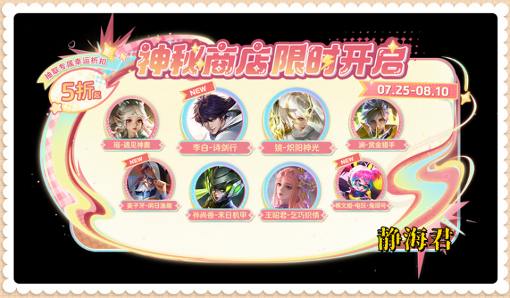 以25年7月25日上线的神秘商店活动来举例,当时小王还着重宣传了一下说李白的诗剑行、姜子牙的闲日渔趣、蔡文姬的电玩·兔顽号等皮肤,首次加入神秘商店。