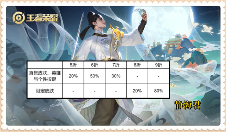 其中,直售皮肤、英雄和个性按键最低折扣是5折,最高折扣也只有7折。但限定皮肤不同,限定皮肤只有两个折扣,一个是8折,另外一个是9折。