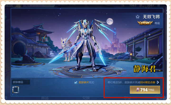 第二,本次奇幻商店首创了一个新模式——在奇幻商店买皮肤的时候,可以用皮肤碎片来抵点券,具体是1个皮肤碎片=10点券。