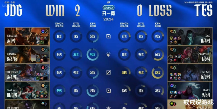 第一局比赛,TES的下路组合被JDG的双人组彻底压制。新AD选手Jiaqi在比赛中显得手足无措,几次关键团战都像是在"打野",而不是在打AD。JDG的辅助Cryin更是如影随形,每次配合打野Kanavi的gank都精准到令人发指。TES的打野Karsa想抓机会,结果被JDG的野辅组合反打,直接送了两血。更搞笑的是,TES的上单369在中期团战中居然在打野位置蹲草,差点被JDG的中单Kanavi一技能直接带走,这操作让解说都忍不住笑场。