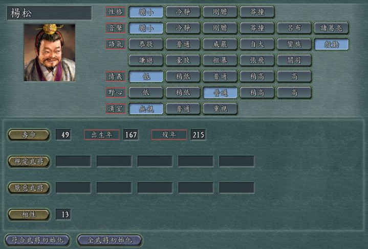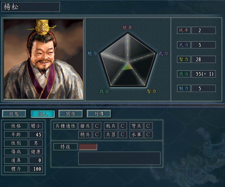 再看他的五维属性,简直是菜鸡中的菜鸡,统率2、武力5、智力28、政治35、魅力5,除了政治勉强能看,其余属性全是垫底水平。这样的属性别说上战场打仗,就算让他去搞内政、运粮草,都得担心他把事情办砸。唯一的用处可能就是作为反面教材,提醒玩家做人不能太杨松吧!