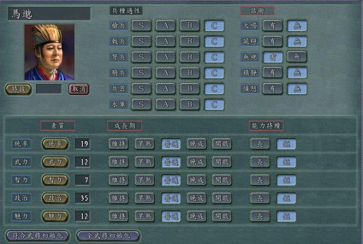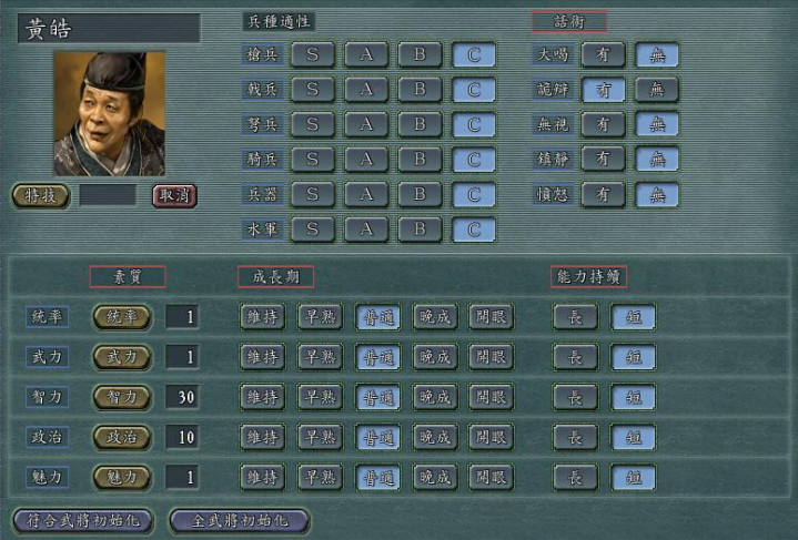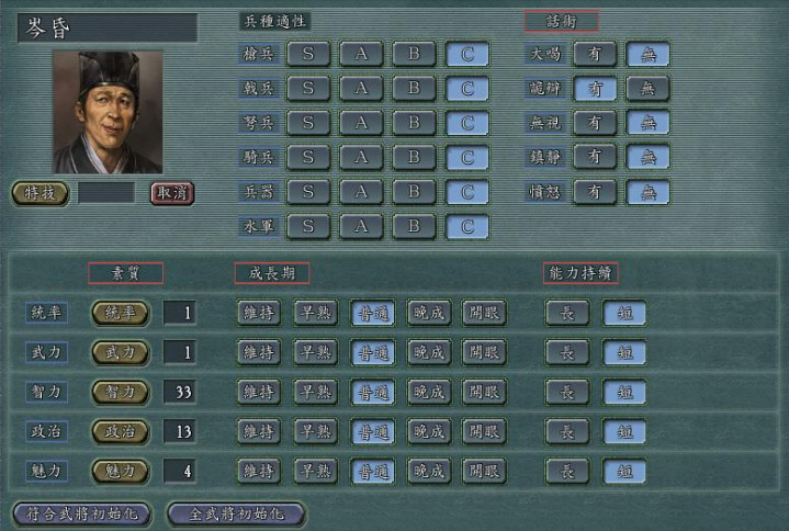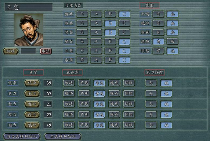再看他的五维属性,统率39、武力57、智力21、政治27、魅力49,全属性应该是这五位中最高的了,但依然是个名副其实的废将。在剧情里,王忠是曹操麾下的将领,却没什么拿得出手的战绩。而在游戏里,王忠的宿命似乎早已注定,登庸他之后,他唯一能胜任的工作就是运输大队长。毕竟属性实在太低,上战场就是送人头,搞内政也是白费功夫,只有运粮草这种没什么技术含量的活,他还能勉强胜任。