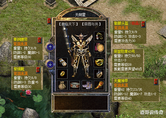 第二,攻防一体服饰系列在服饰五件套方面这位巨战也是天花板级别的搭配:青铜腰带和紫绸靴高防御加持是现阶段巅峰;天魔神甲和荣誉勋章43号通用是战士巅峰系列;至于骷髅头盔多加了3点攻击属性似乎略低了点,毕竟新百区还有少数攻4头盔甚至更高的存在。当然了,骷髅头盔2-3的防御属性也不容忽视。整体来看这攻防一体的服饰系列同样逆天。