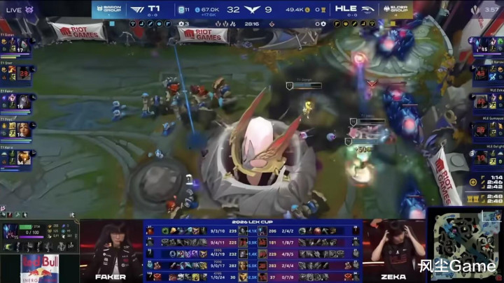 前期大O围绕中路拿到优势,团战T1又是连续获胜,15分钟领先4.4K,多兰阿卡丽团战各种收割,打到20多分钟,T1就开始冲高地杀人了,比赛28分钟结束,两队人头比达到了夸张的32:9,HLE全程没推掉T1一个塔,小龙也只拿到了一条,属于是被打成人机了,毫无还手之力的那种。