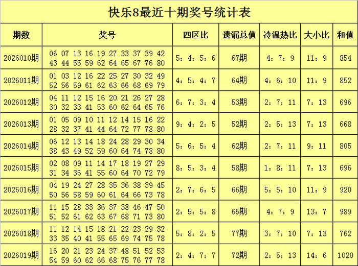 福彩快乐8第2026019期开奖回顾:16 20 21 23 24 37 48 51 52 53 54 59 60 62 66 68 75 76 77 78,其中奖号四区比为2:4:7:7,遗漏总值为72,大小比为14:6,012路比为9:4:7,和值为1020。