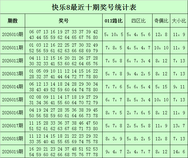 福彩快乐8第2026019期开奖回顾:16 20 21 23 24 37 48 51 52 53 54 59 60 62 66 68 75 76 77 78,其中奖号012路比为9:4:7,四区比为2:4:7:7,奇偶比为8:12,大小比为14:6。