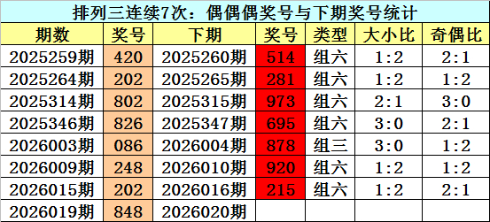 奇偶判断:上期排列三奖号为848,奇偶为:偶偶偶,近7次出现奇偶:偶偶偶奖号分别为:420-202-802-826-086-248-202。
