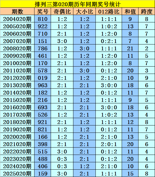 本期为排列三第2026020期开奖,历史上排列三第020期已开出了22期奖号了: