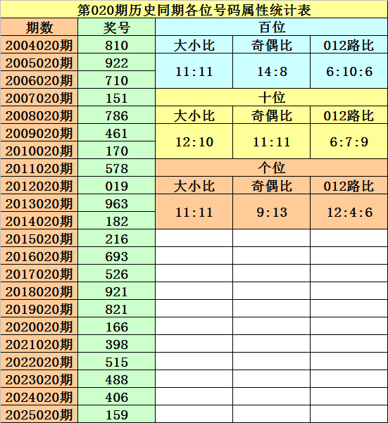 开奖回顾:排列三第2026019期开出奖号848,奖号012路比为0:1:2,大小比为2:1,奇偶比为0:3,最近三年第020期同期开出奖号为:第2023020期:488、第2024020期:406、第2025020期:159。