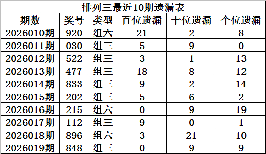 上期回顾:排列三第2026019期奖号:848,组三,直选遗漏总值为18期。