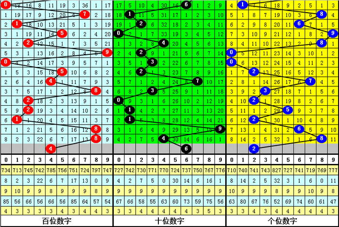 十位:上期为4,近10期012路比为4:4:2,其中1路号遗漏1期出现,本期排除1路号,注意0路号出现,关注6。