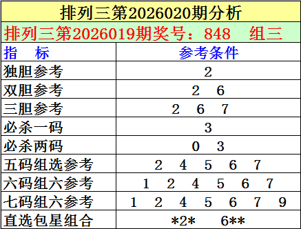 1.排列三最近十期分别开出号码:920-030-522-477-833-202-215-112-896-848,其中有5期奖号开出了上期的重复号码,本期防重号轮空,排除第2026019期奖号:848中的号码,关注号码:2。