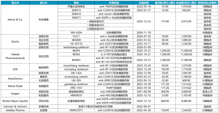 TOP20MNC与中国转变药企达成的ADC药物来去