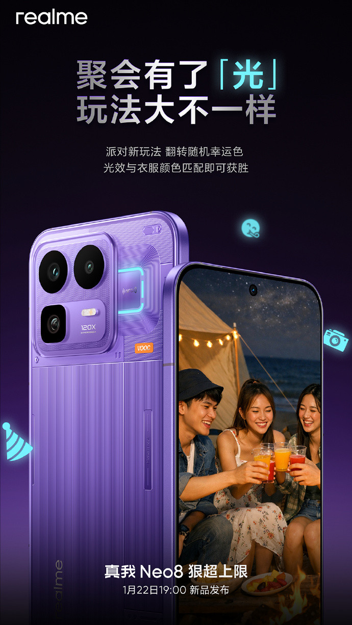 真我Neo8定于1月22日19:00举办新品发布会,以“无越级,不发布”为口号,主打中端市场全能体验。新机全球首发165Hz三星苍穹屏,采用M14发光基材,支持2600nit峰值亮度与720Hz触控采样率。搭载骁龙8 Gen5处理器,搭配LPDDR5X内存与UFS4.1闪存,综合跑分超358万,首发自定义温控调节功能。内置8000mAh电池+100W快充,后置5000万主摄+3.5X潜望长焦三摄,支持OIS防抖。提供三款配色,配备金属中框与IP68防水,目前1元预约活动已开启,可享多重首发福利。