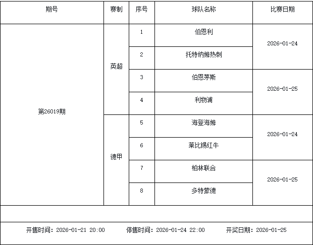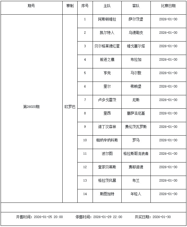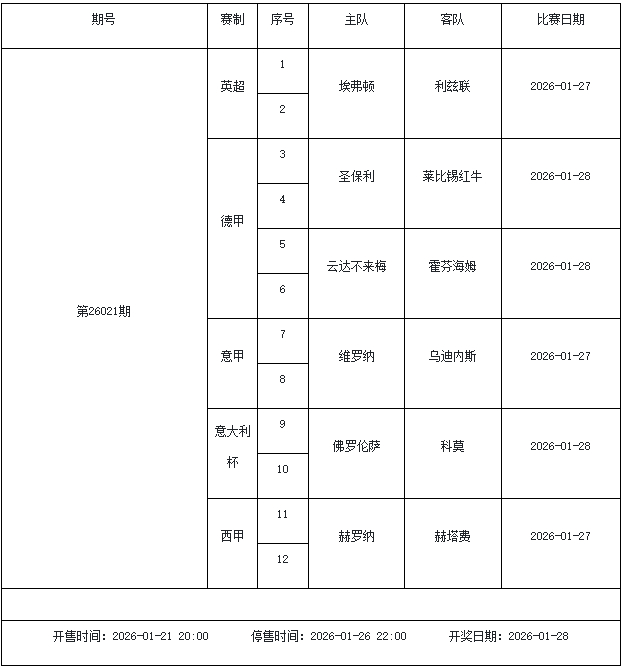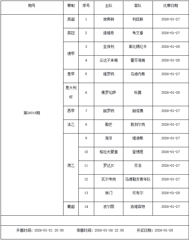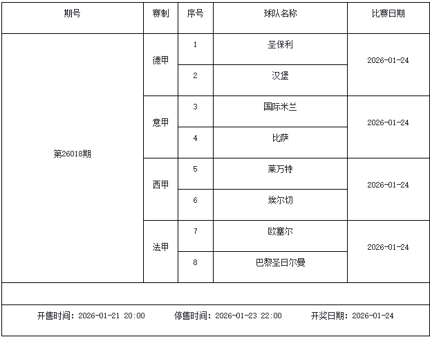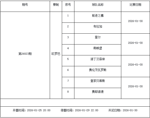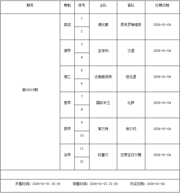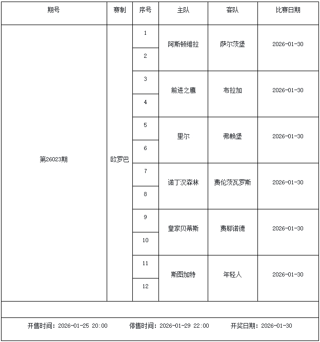 北京时间2026年1月20日,国家体彩中心公布了2026年1月23日-1月29日的足彩赛程,1月23日(周五)、1月24日(周六)、1月25日(周日)、1月26日(周一)、1月28日(周三)、1月29日(周四)共6期。其中26015期竞猜英冠德甲德乙意甲西甲法甲法乙荷乙葡超赛事、第26016期、26017期由欧洲五大联赛组成、26018期由英超英冠德甲意甲意杯西甲法乙荷乙葡超组成、26019期全部为欧冠赛事、26020期为欧罗巴赛事。