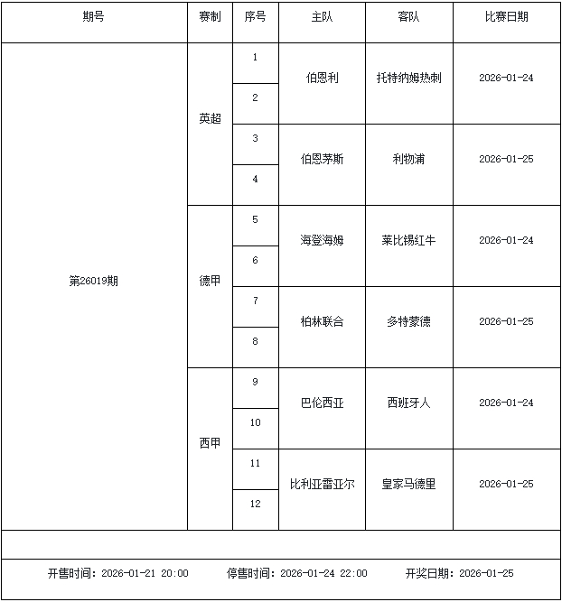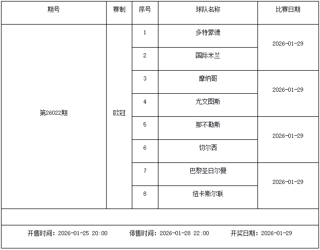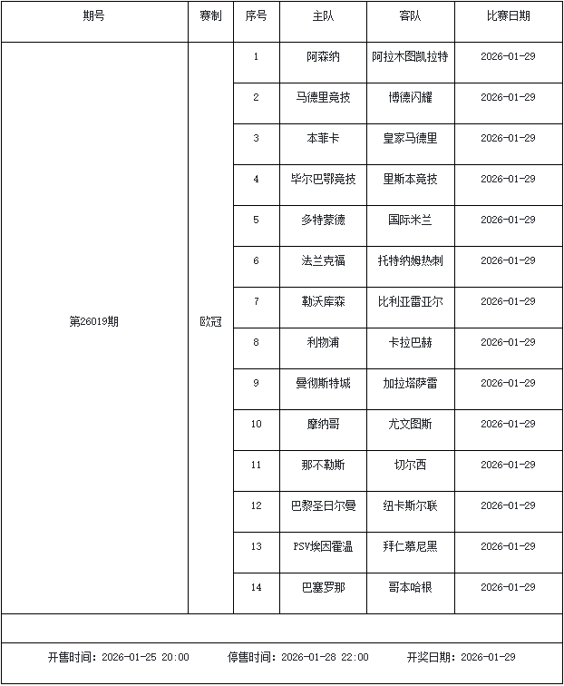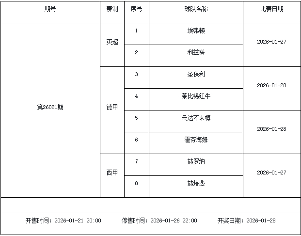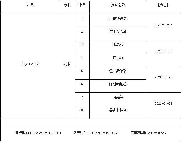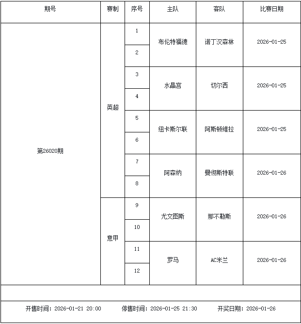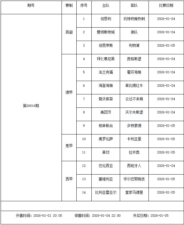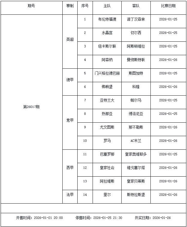 我中心制定了2026年中国足球彩票胜负游戏(14场、任选9场)、6场半全场胜负游戏和4场进球游戏1月23日-1月29日的竞猜场次安排(具体附后),其竞猜对象、开售时间、停售时间和计奖时间均以本文为准。