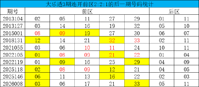 体彩大乐透第26005期开奖,前区开出02 04 16 23 35,后区为06 11;第26006期开奖,前区为05 12 18 23 35,后区为06 12;第26007期开奖,前区为01 03 13 20 26,后区03 10;前区连续4期开出三区比2:2:1,此前大乐透历史上从未连续4期开出三区比2:2:1的情况,这种现象实属罕见。实际上,此前在大乐透开奖历史中,连开3期三区比2:2:1也只发生过11次。