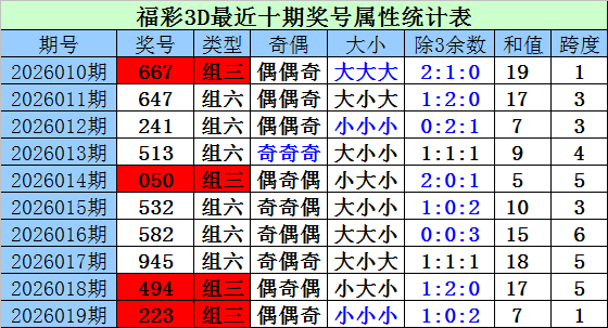 上期回顾:上期开奖奖号为223,类型:组三,偶偶奇,小小小,1:0:2,和值7,跨度1。