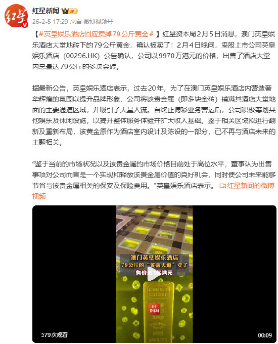 [#英皇娱乐酒店回应卖掉79公斤黄金#]红星资本局2月5日消息,澳门英皇娱乐酒店大堂地砖下的79公斤黄金,确认被卖了!2月4日晚间,港股上市公司英皇娱乐酒店(00296.HK)公告确认,公司以9970万港元的价格,出售了酒店大堂内总量达79公斤的多块金砖。