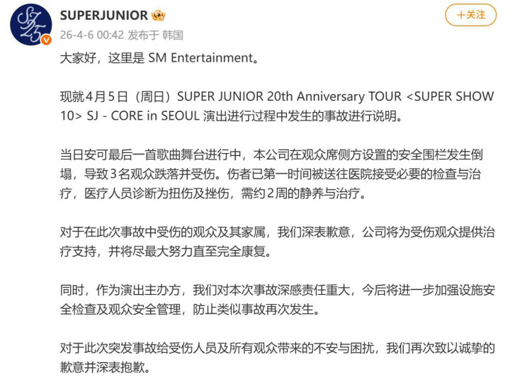 现就4月5日(周日)SUPERJUNIOR20thAnniversaryTOURSUPERSHOW10SJ-COREinSEOUL献技进行经过中发生的事故进行贯通。